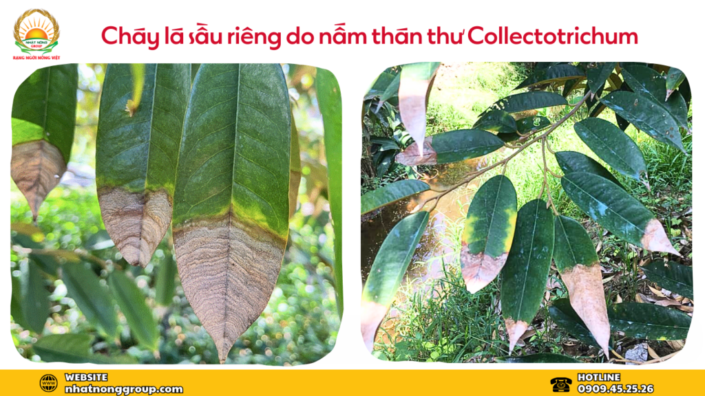 Bệnh thán thư trên sầu riêng do nấm Colletotrichum gloeosporioides gây ra, phổ biến trong mùa mưa, gây đốm lá, khô cành, rụng bông/trái non. Vết bệnh đặc trưng là các đốm nâu lõm hoặc đen có viền rõ rệt, thường bắt đầu từ mép hoặc chóp lá, làm lá khô cháy từ ngoài vào trong và rụng. Khi bệnh nặng, lá sẽ héo rũ nhanh và rụng sớm, ảnh hưởng lớn đến quá trình sinh trưởng của cây.