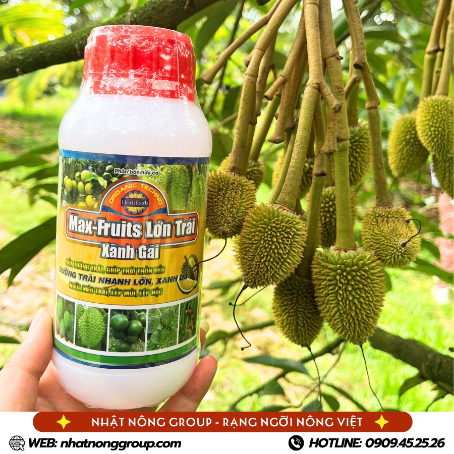 Một trong những sản phẩm được nhiều nhà vườn sử dụng là Max Fruits lớn trái xanh gai – dòng dinh dưỡng chuyên dùng cho giai đoạn nuôi trái sầu riêng.