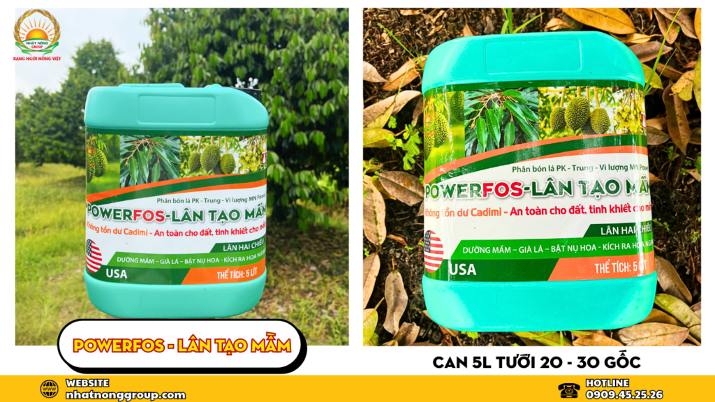 POWERFOS LÂN TẠO MẦM 5L – GIÀ LÁ, DƯỠNG MẦM, KÍCH RA HOA SẦU RIÊNG ĐỒNG LOẠT