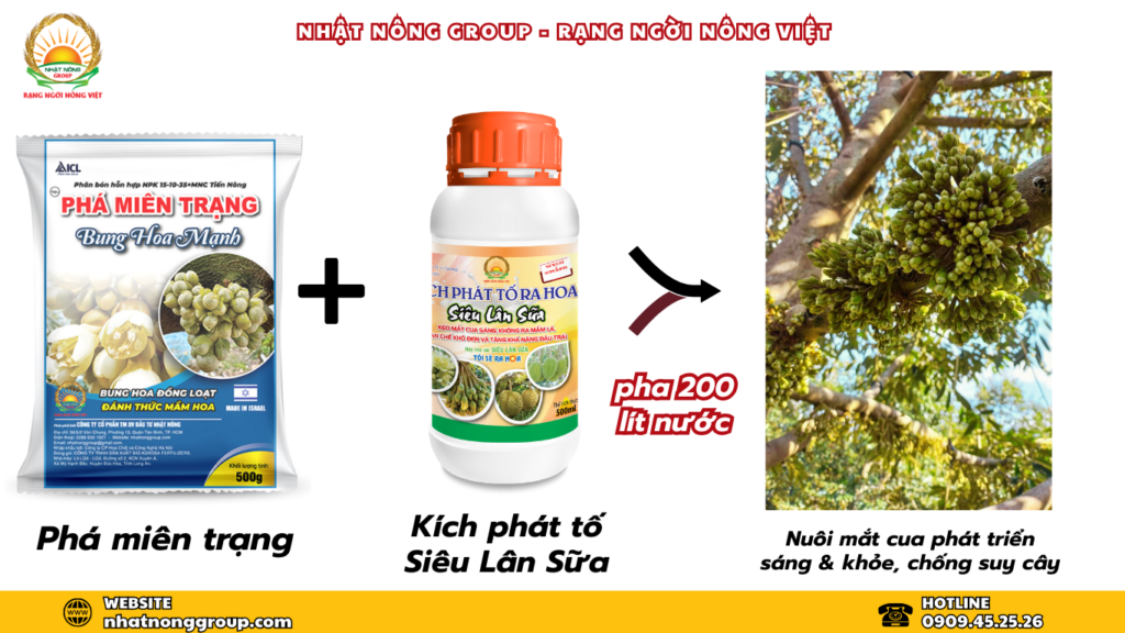 Bà con cần kết hợp kỹ thuật tạo khô hạn (xiết nước, phủ bạt) và bón phân giàu Lân (P) và Kali (K) (NPK 10-60-10, 0-60-20, MKP, Lân 86), có thể dùng lân nước như Siêu Lân đỏ, Lân Uni, đồng thời phun bổ sung dưỡng chất và vi lượng vào giai đoạn thích hợp để kích thích mầm hoa, kéo đọt và nuôi hoa/trái sau này, đảm bảo cây ra hoa đồng loạt và đậu quả tốt.