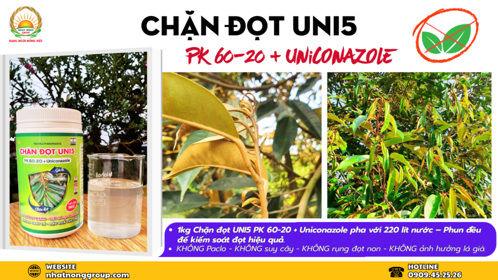 Cách chặn đọt sầu riêng với sản phẩm Chặn đọt UNI5 PK 60-20 + Uniconazole là giải pháp tối ưu. Giúp nhà vườn chủ động kiểm soát sinh trưởng. Đảm bảo cây khỏe – bông đẹp – trái đạt chất lượng cao.