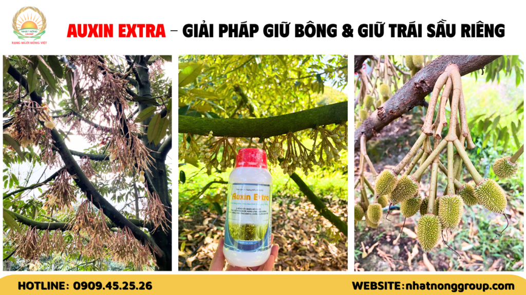 Trong bối cảnh thời tiết nắng nóng cực đoan, các dòng sản phẩm điều hòa sinh trưởng đóng vai trò then chốt. Nổi bật trong đó là: AUXIN EXTRA – Giải pháp giữ bông & giữ trái sầu riêng kịp thời. Sản phẩm chuyên dùng để:
