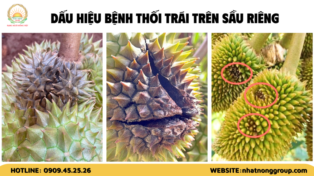Dấu hiệu bệnh thối trái thường bắt đầu bằng các đốm nâu đen nhỏ ở đít trái hoặc gai, sau đó lan rộng thành mảng đen, lõm xuống và thối nhũn. Trái bệnh có mùi hôi chua, xuất hiện tơ nấm trắng trong thời tiết ẩm, dễ lây lan cả vườn và gây rụng trái.