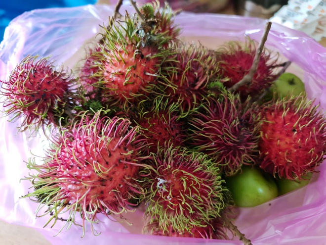 Chôm chôm được thương nhân mua tại vườn giá 7.000 – 10.000 đồng/kg nhưng giá bán tại chợ sáng 4/8 là 25.000 đồng/kg. Ảnh: Việt Tường.