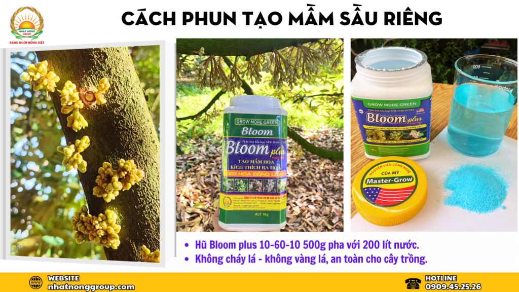 Bloom Plus 10-60-10 giúp cây hoàn tất sinh trưởng dinh dưỡng, ức chế phát triển đọt non, từ đó tập trung dinh dưỡng cho phân hóa mầm hoa, đặc biệt quan trọng trong giai đoạn siết nước – xử lý bông sầu riêng.